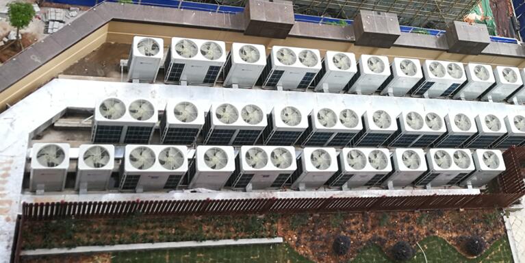 南寧地處夏熱冬暖氣候區域,對空調高溫制冷,快速制冷有極高要求,此外冬季也能快速制熱。結合項目特點,EK為其提供風冷全變頻多聯式中央空調方案: ①根據房間不同功能,選擇不用形式的室內機。部分區域采用全新風機組引入新風。 ②室外機置于6層裙房屋面(見下圖)以及12F、24F避難層的設備間。 ③機組開放Modbus協議,接入樓宇自控系統,方便客戶集中控制管理。