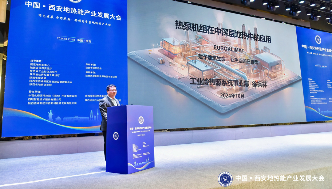 會上,EK工業(yè)冷熱源系統(tǒng)事業(yè)部徐楓林發(fā)表精彩演講,詳細(xì)介紹熱泵機(jī)組在中深層地?zé)嶂械膽?yīng)用。徐楓林指出,中深層地?zé)衢_發(fā)“取熱不取水”供暖技術(shù),通過熱泵技術(shù)或板換產(chǎn)生熱水,供給用戶,不受場地條件的制約,運(yùn)行更高效穩(wěn)定,綠色環(huán)保,還能有效保護(hù)水資源。