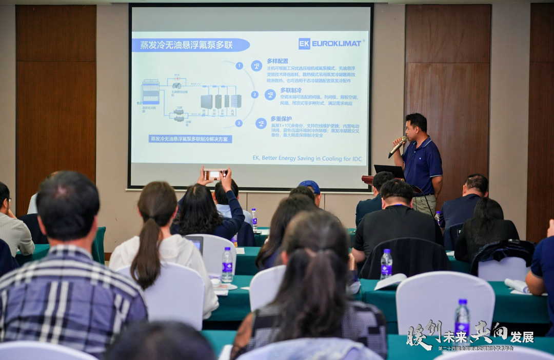 在演講中,古正中詳細介紹EK間接蒸發冷卻機組、無油懸浮多聯蒸發冷機組和一體式蒸發冷螺桿冷水機組等綠色低碳系統方案,為行業帶來EK空調在蒸發冷技術方面的思路和解決方案。