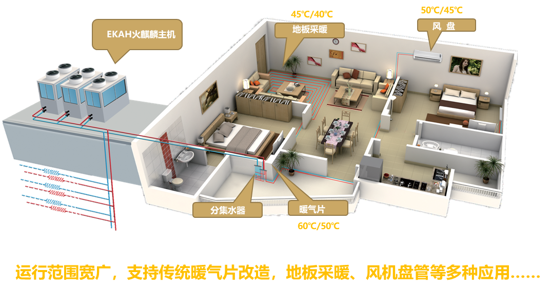 EK超低溫空氣源熱泵機組憑借超低溫環境穩定制熱、寬域運行范圍、智能運維等卓越性能與廣泛的應用場景,在北方煤改電采暖市場中脫穎而出,為工業、商業、民用等多領域提供低碳、舒適的溫暖體驗。