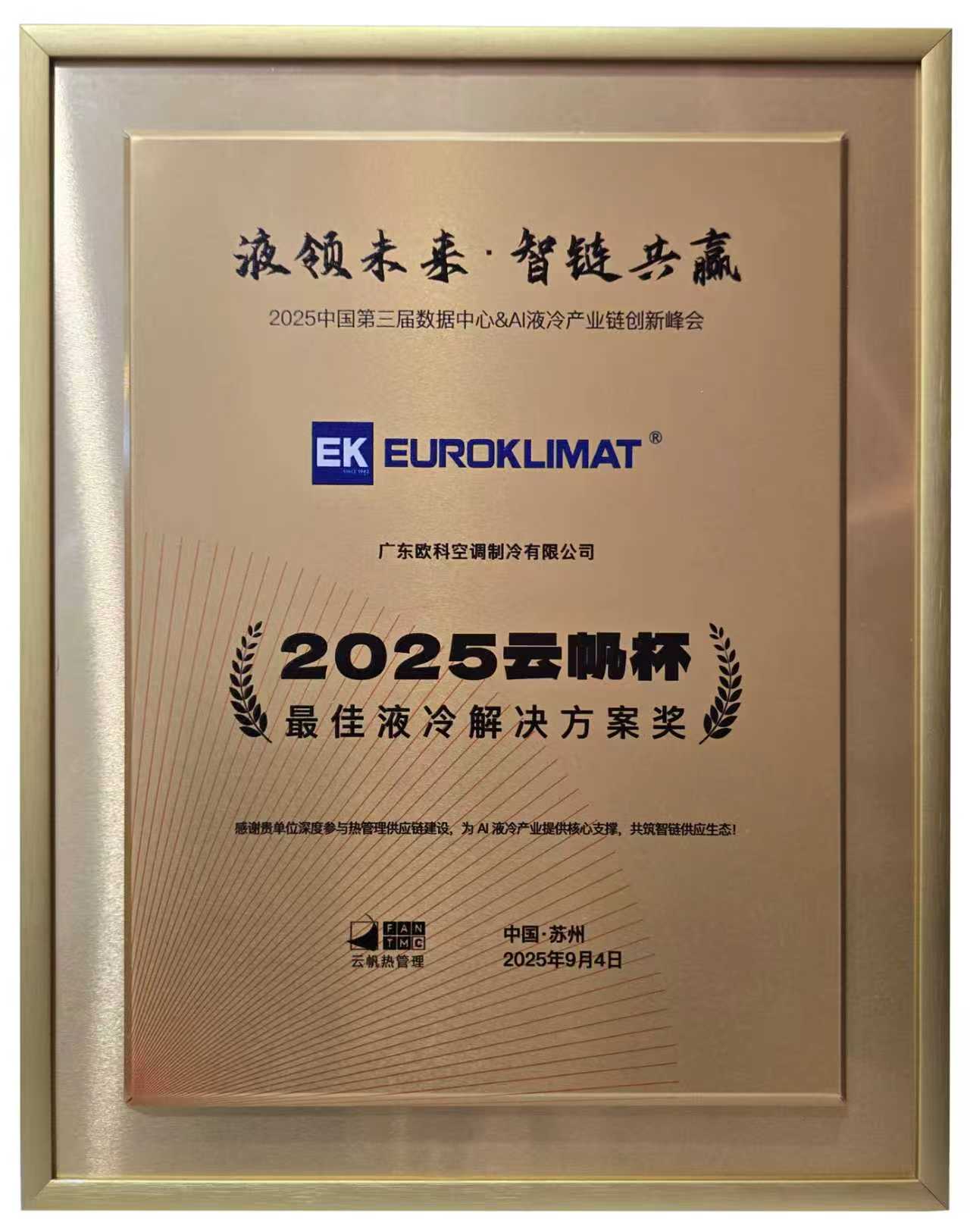 在9月4日上午舉行的頒獎(jiǎng)典禮上,EK憑借在液冷技術(shù)領(lǐng)域的創(chuàng)新突破和卓越的產(chǎn)品解決方案,榮獲"云帆杯2025年度最佳液冷解決方案獎(jiǎng)"