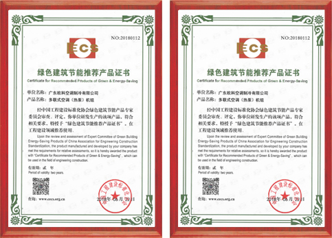 綠色建筑節(jié)能推薦產(chǎn)品證書-多聯(lián)式空調(diào)